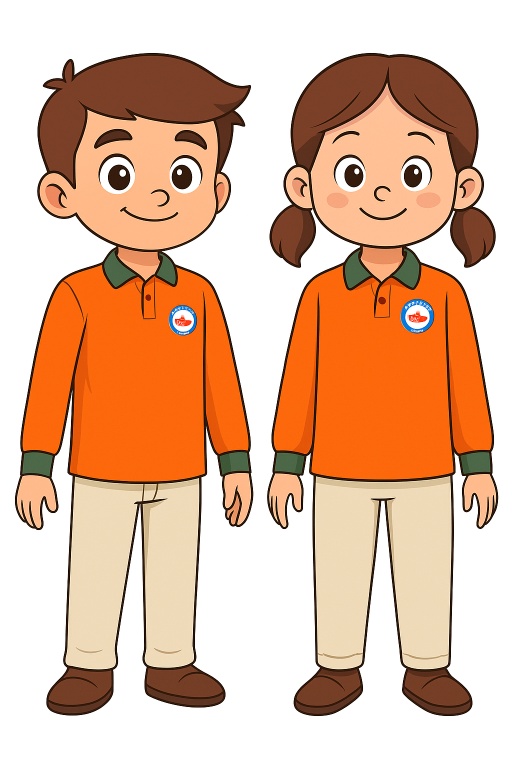 Doğal ve sağlıklı kumaşlardan(pamuklu), polo yaka, sol tarafta okul arması yer alan, turuncu renk kısa kollu tişört ve uzun kollu sweatshirt.